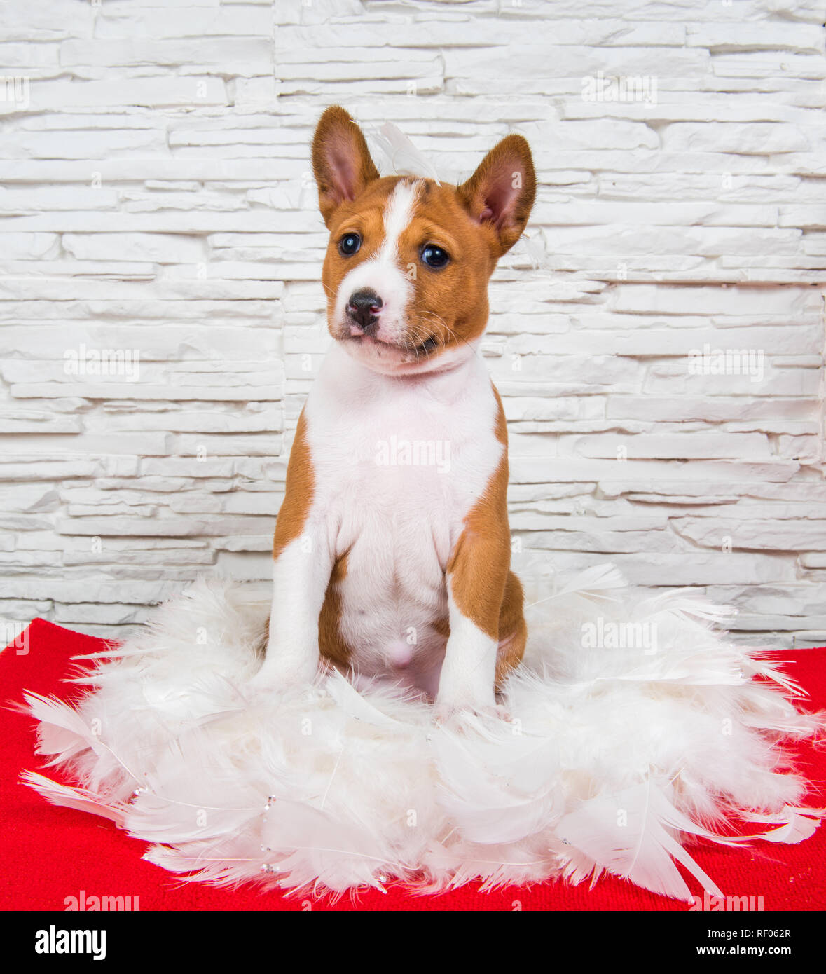 Funny Red Basenji Puppy Dog Is Sitting In White Feathers Greeting